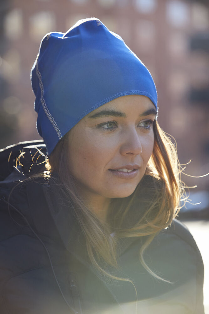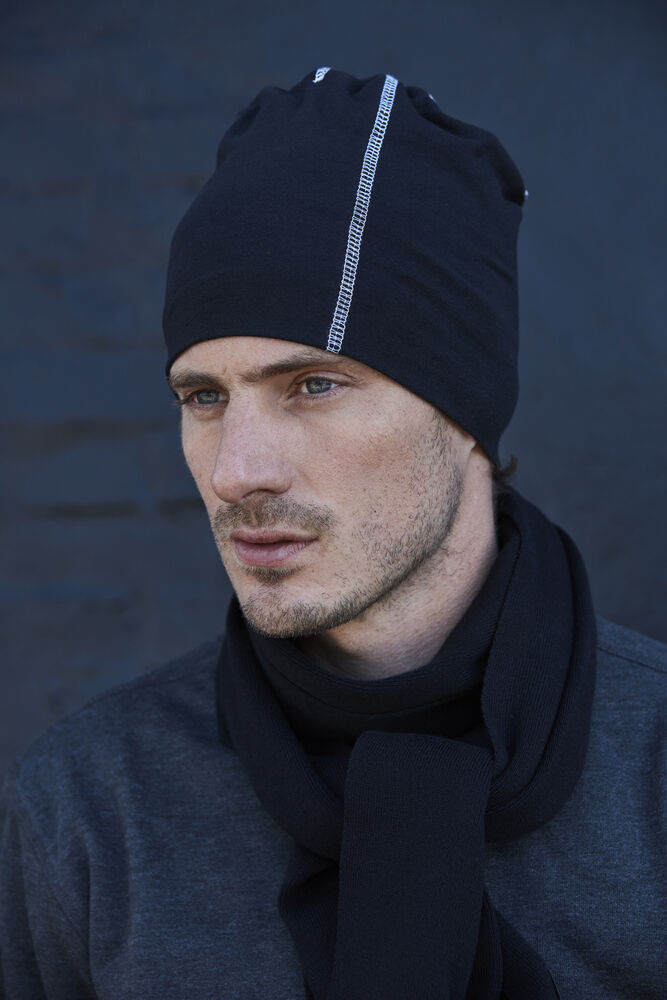 Mütze aus elastischem Fleece. 6 reflektierende Flatlock-Nähte.