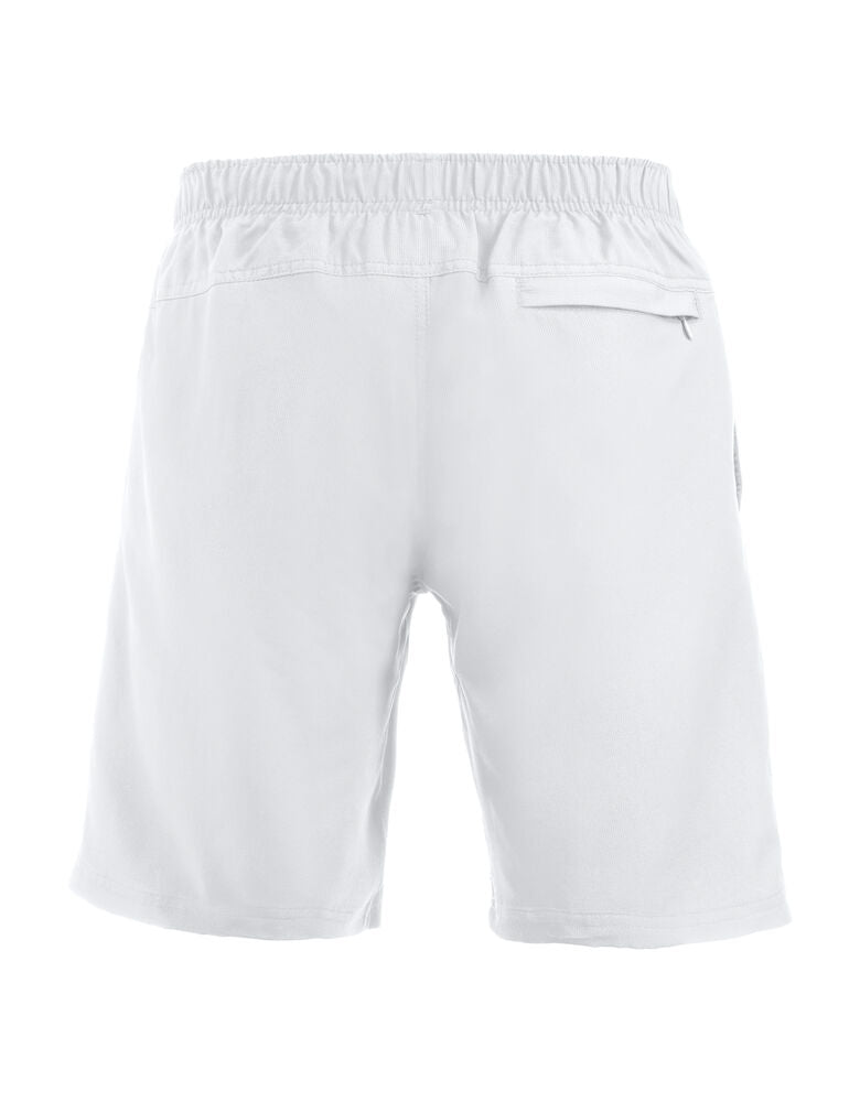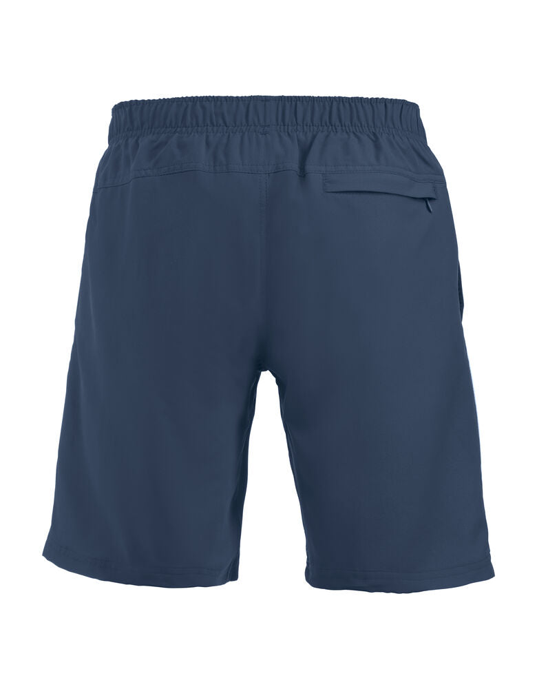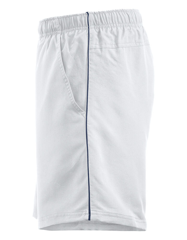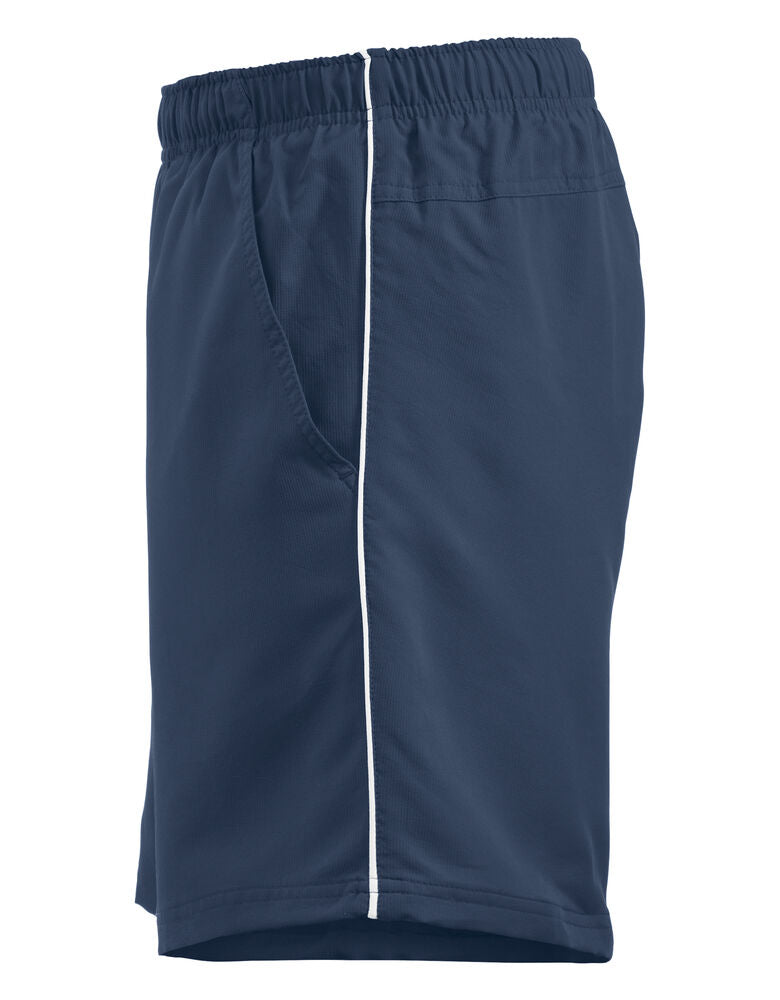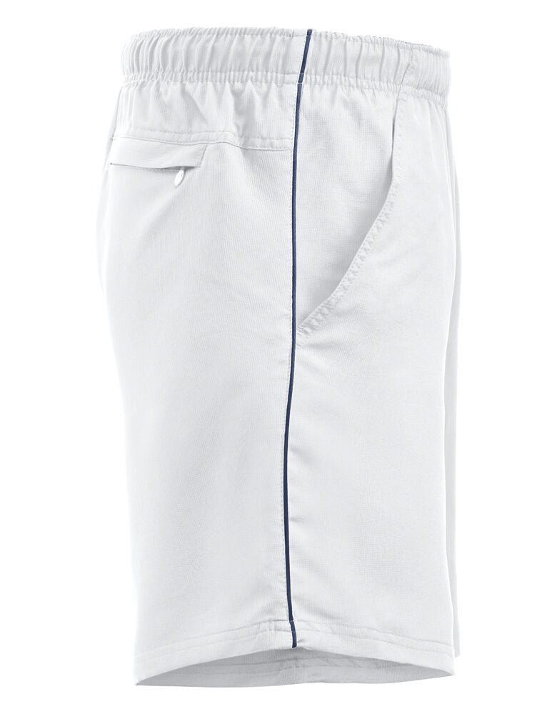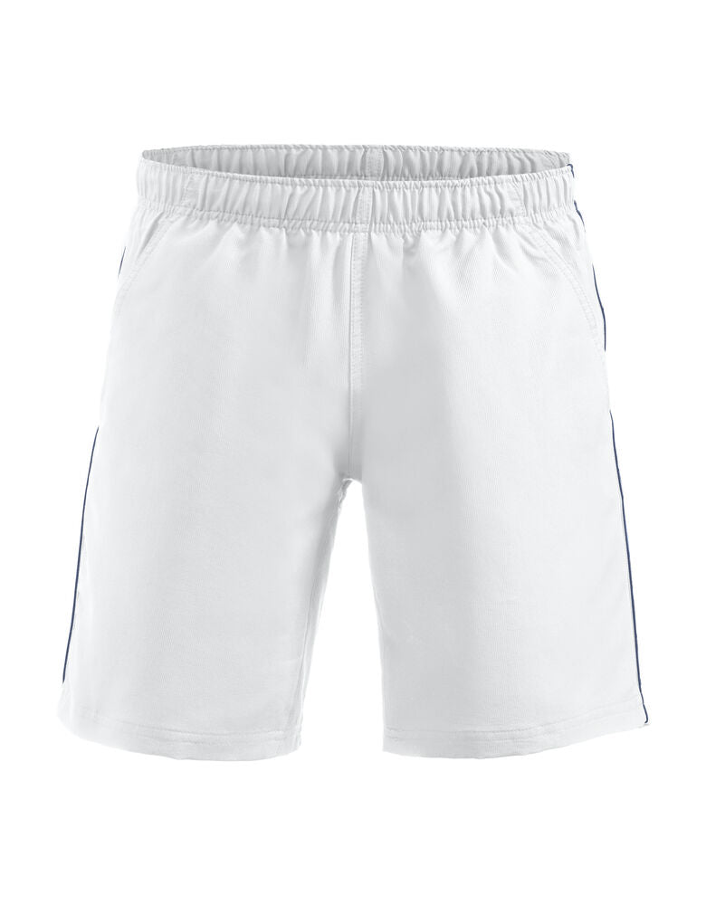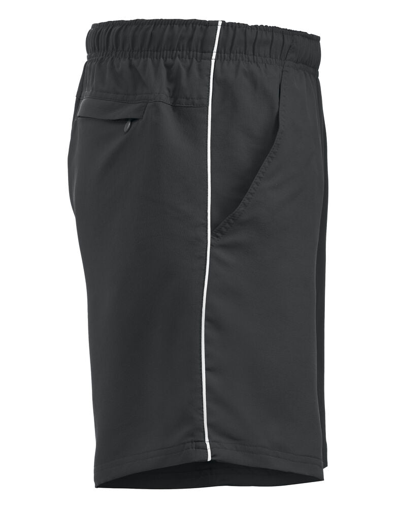 Sportliche Unisex-Shorts, Kontraststreifen an den Seitennähten, zwei Taschen vorne und eine Gesäßtasche mit Reißverschluss, Netzfutter, Bund mit elastischem Kordelzug. Waschbar bis 40°C.