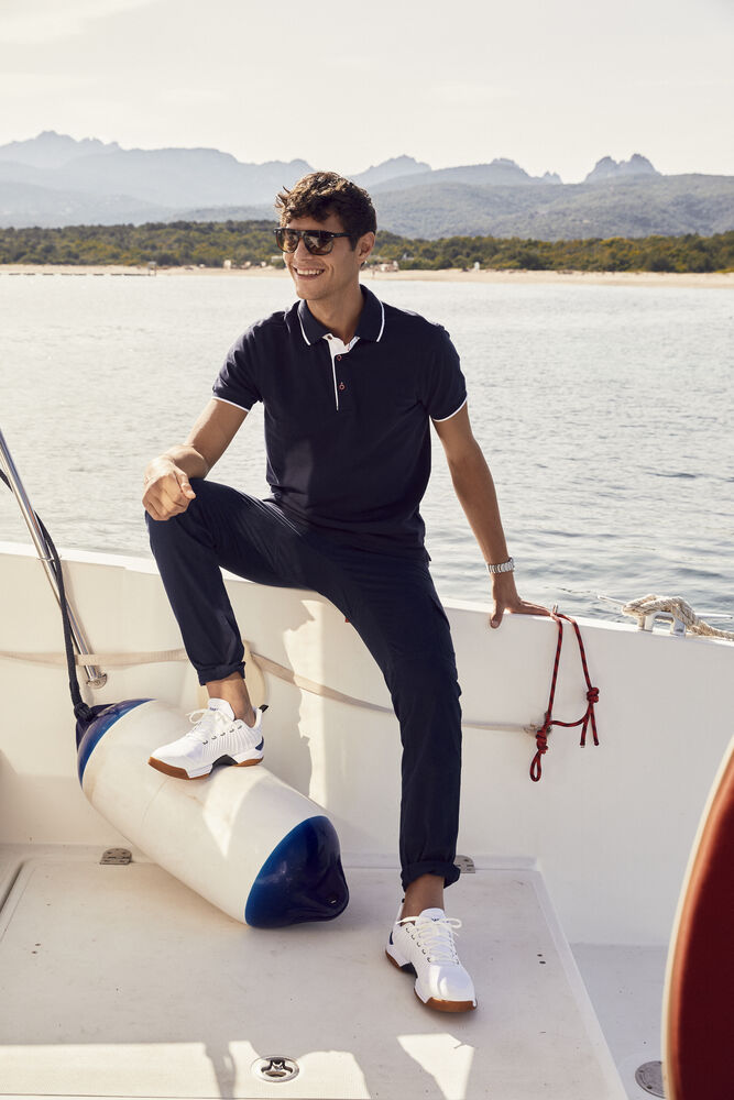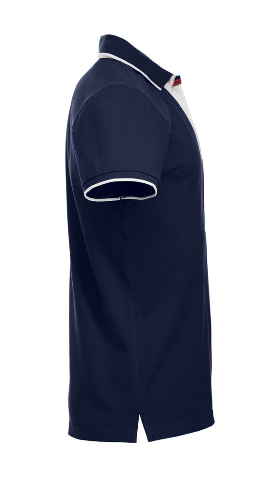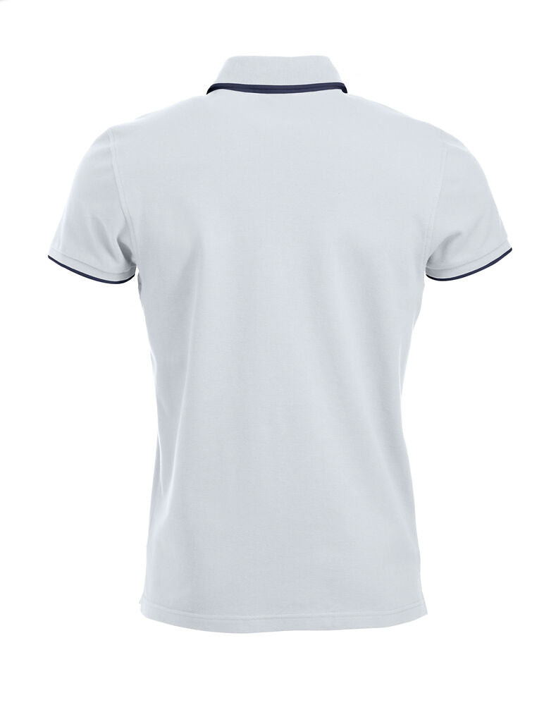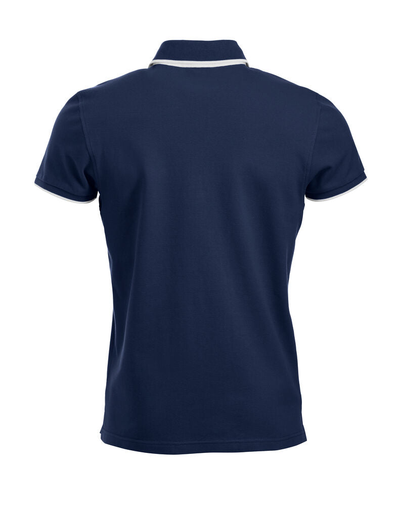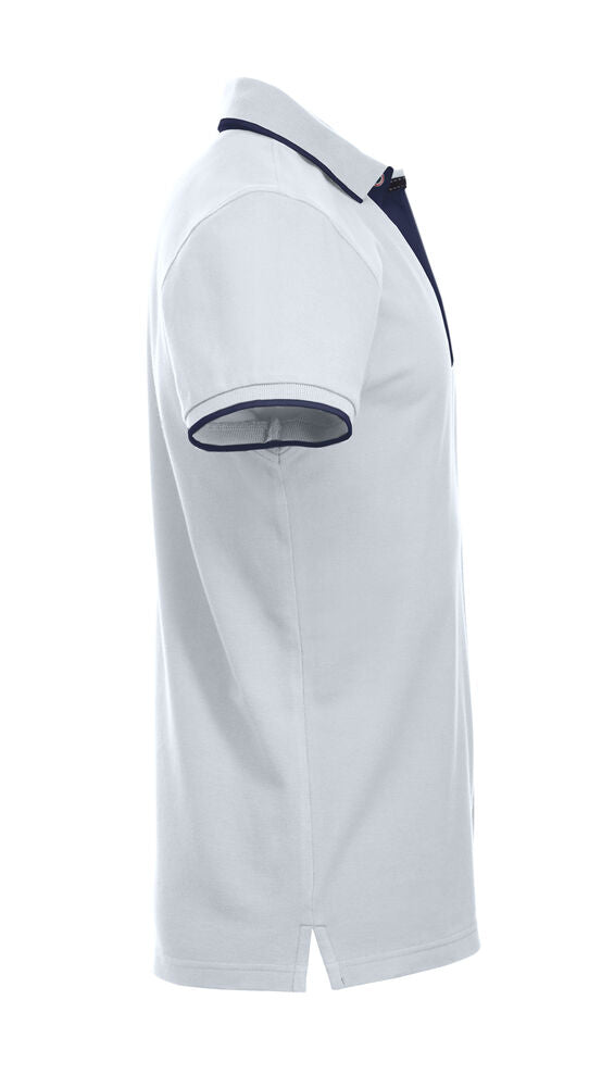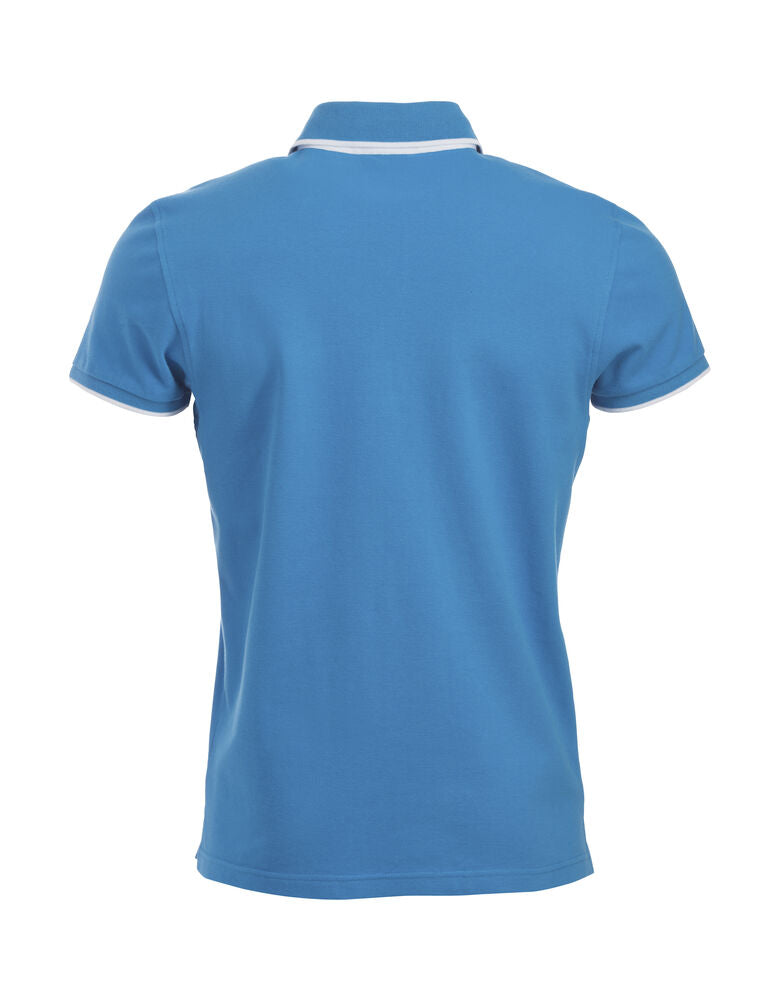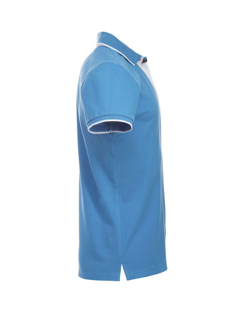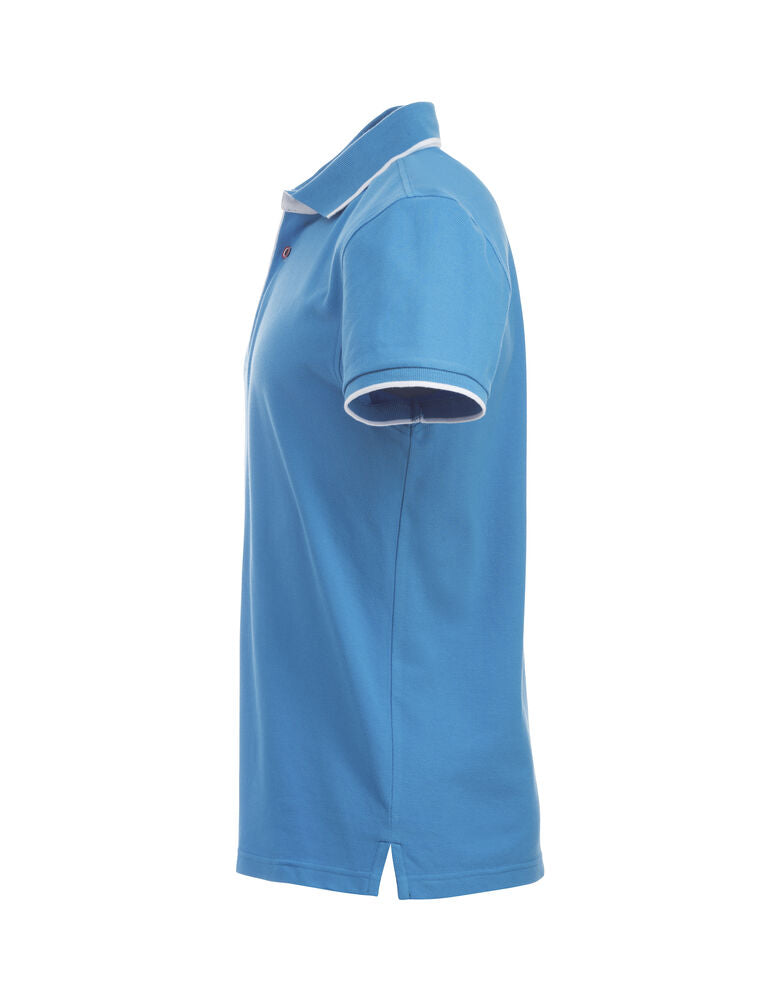 Polo mit Kontrastfarbe an Knopfleiste, Nackenband und Seitenschlitzen. Kontraststreifen am Kragen und Ärmelbündchen. 3 Knöpfen bei Herren und 5 bei Damen. Waschbar bis 40°C.
