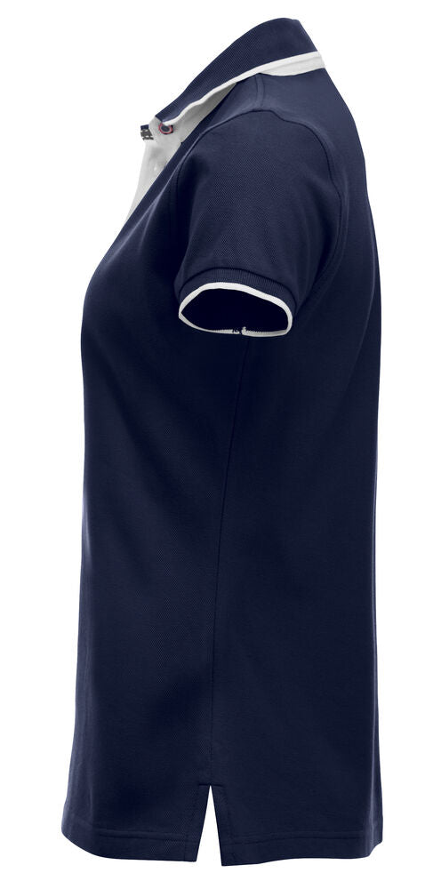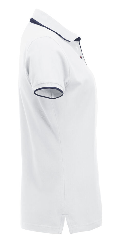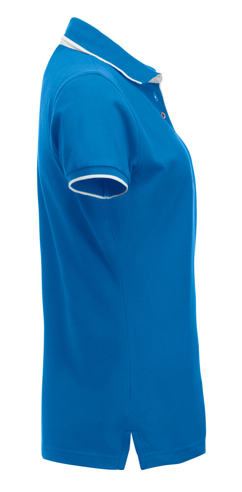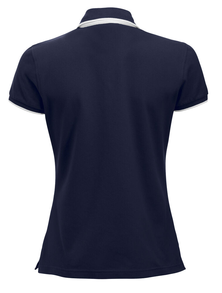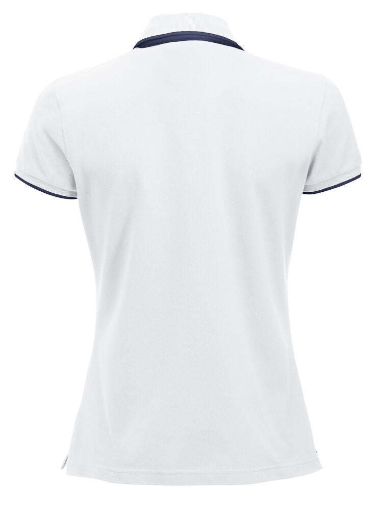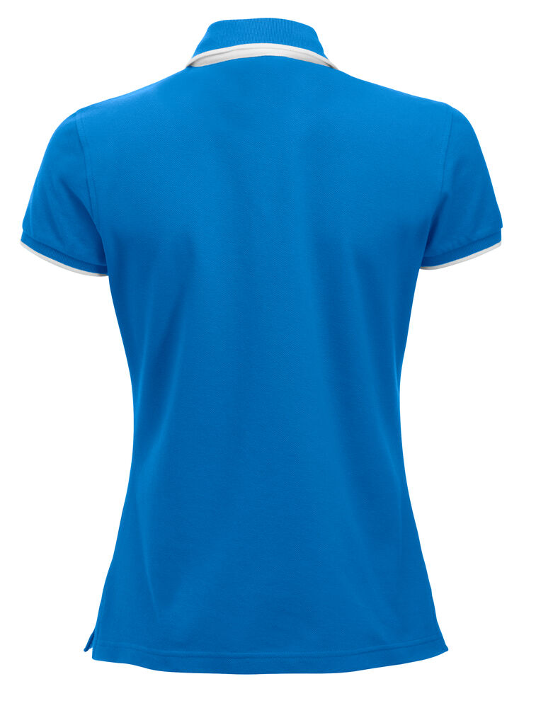 Polo mit Kontrastfarbe an Knopfleiste, Nackenband und Seitenschlitzen. Kontraststreifen am Kragen und Ärmelbündchen. 3 Knöpfen bei Herren und 5 bei Damen. Waschbar bis 40°C.